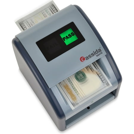 Check counterfeit bills and ensure identification cards are authentic in one easy-to-use platform with the Cassida Omin-ID! It uses advanced infrared sensors and a comprehensive database of mapped infrared magnetic and ultraviolet bill markings to verify if a bill is legitimate or counterfeit. Verifying the infrared security markings on a bill is the most reliable anti-counterfeit protection available in paper currency. The simple PASS/FAIL interface provides clear quick feedback on a bill s authenticity. Simply insert the cash in question in the direction illustrated on machine (face up facing outward). The Omni-ID also includes UV LED lights to check for authentication marks on a wide variety of identification cards: driver s licenses credit cards passports and more! The lights used in the Omni-ID were scientifically selected to brilliantly illuminate security markings in any lighting- even under the bright lights of a retail store! The Omni-ID is backed by a one-year warranty and Cassida s helpful US-based support team. If you count on cash for your business count on America?s #1 brand in business-grade currency handling solutions: Cassida!